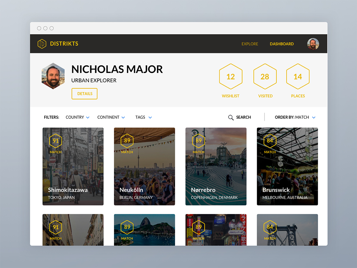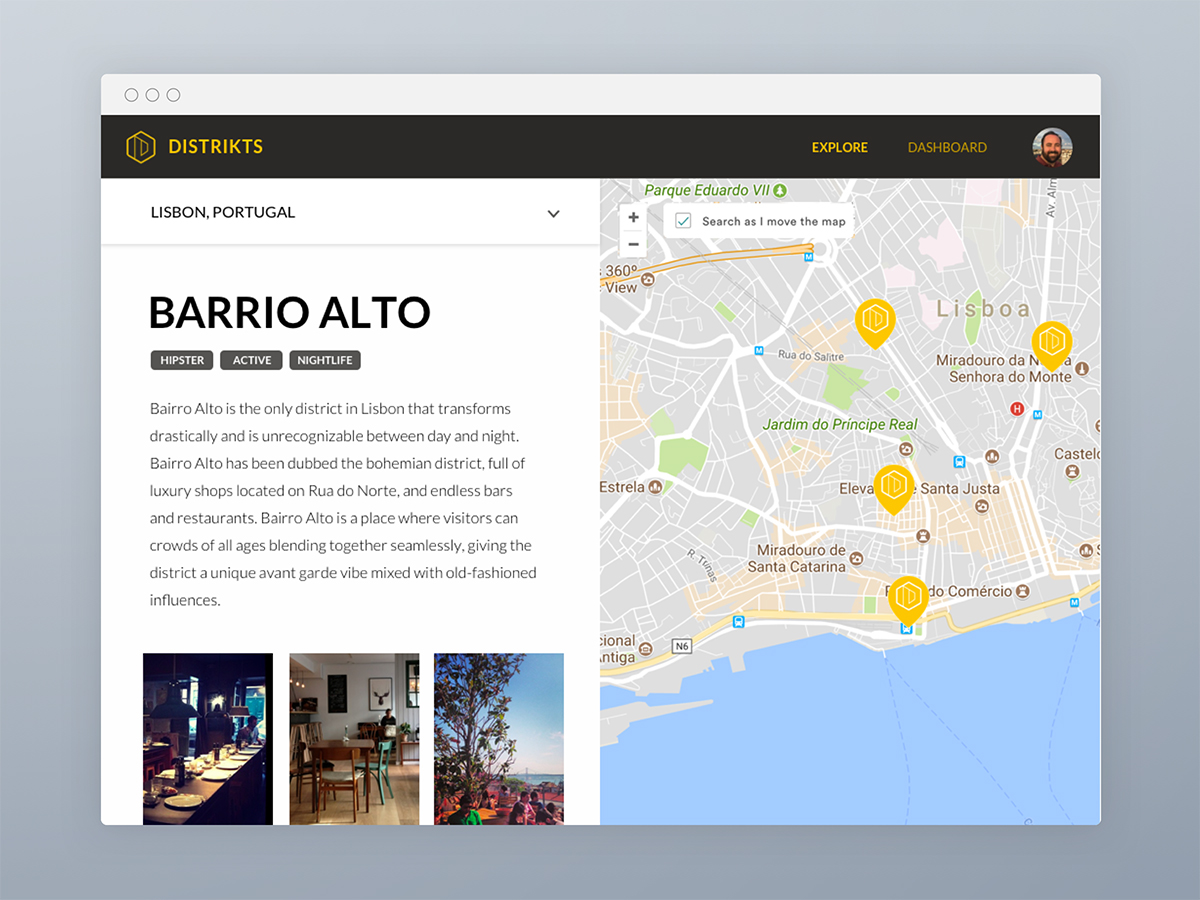 Born out of an idea to map out cities based on their neighborhood's personalities, we built this functional prototype in ten days. What started as a challenge to understand the complexities of full stack development, this project also launched a question of how we see and explore cities today. Distrikts also asked how our travel goals have shifted from one of "collecting places," to one of seeking real connection with a city and the people within.