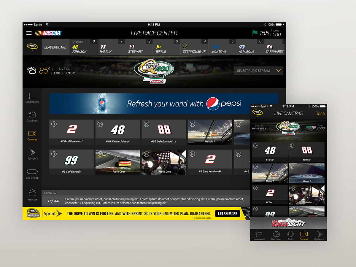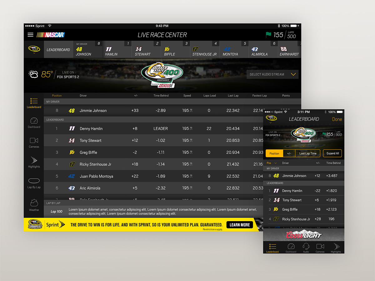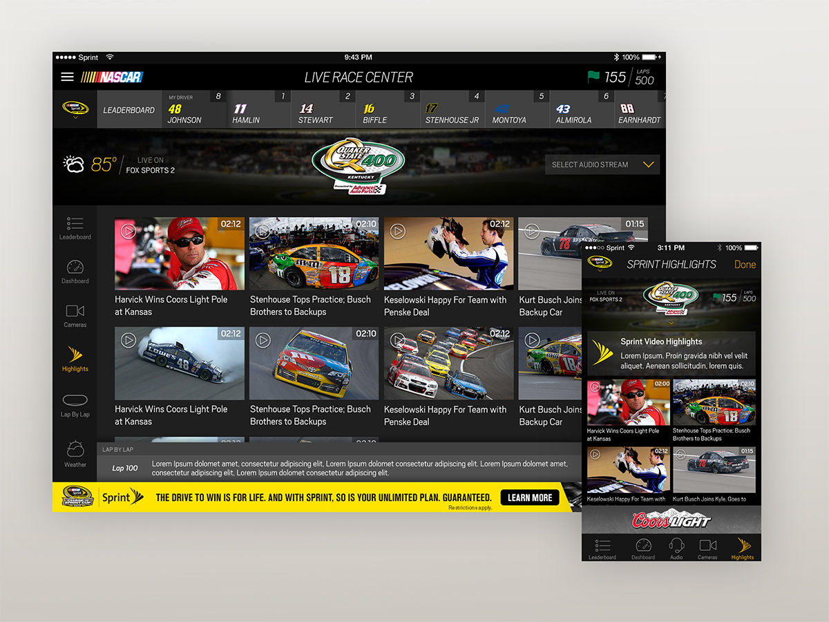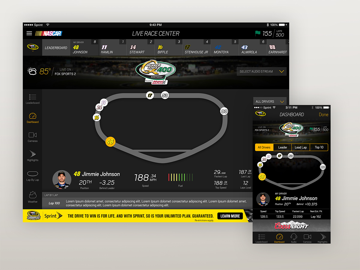 Through the NASCAR app, we looked to take advantage of the advanced real-time race data and enhance the way viewers experience a race. Functionality included live race leaderboards and highlights, exclusive news and videos, ability to listen to the official NASCAR radio, and integration of social feeds.