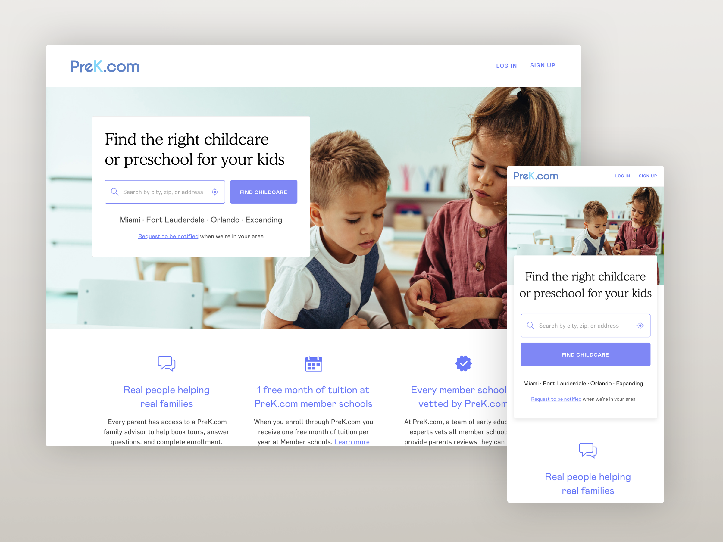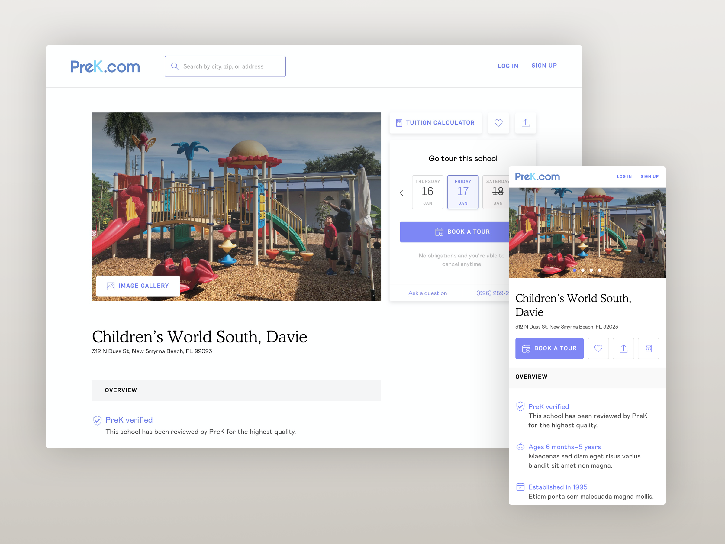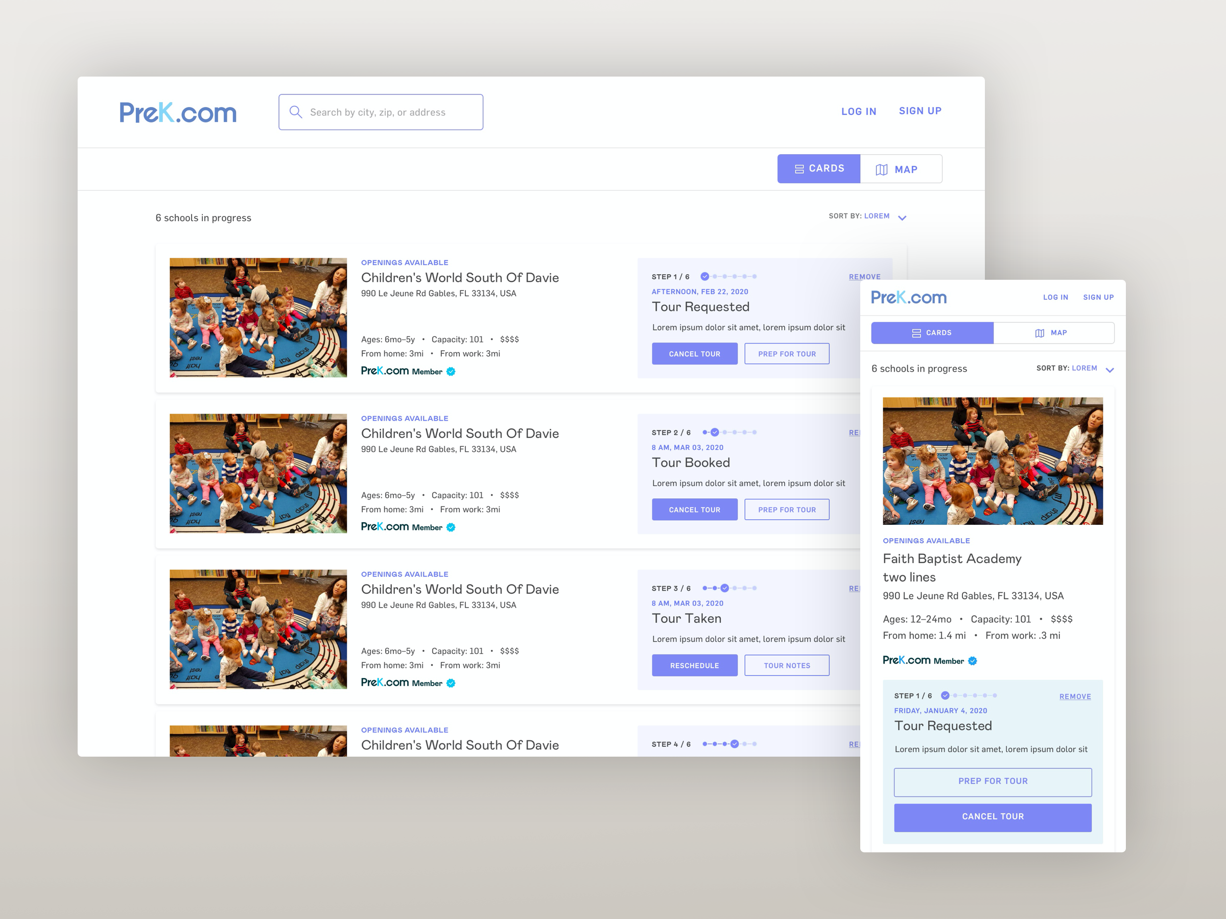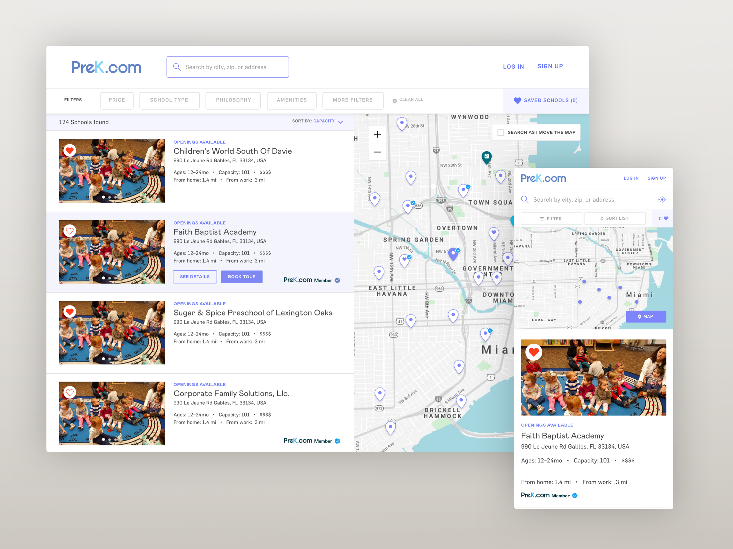 PreK.com is an online platform for arranging daycare and preschool for kids from 6 weeks to 6 years old. As lead UX/UI designer, I helped align strategy to a cohesive experience for parents to search schools and books tours, as well as enroll and pay online. We also implemented a design system to help expedite development, and ensure visual and interactive consistency throughout the site.